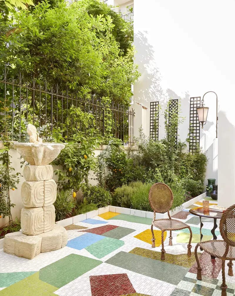 It might be the Spanish connection that gives interior designer Laura Gonzalez and myself a deep appreciation for colour. When asked to imagine a mosaic for her courtyard office, I was inspired by the meeting point between nature and the built environment, thought a combination of venetian glass and White Thassos marble, this mosaic brings light and contrast to the vegetation around, it’s a confluence of contemporary visions with primal forms. This courtyard portraits the world of Laura Gonzalez through a unique and organic custom-made mosaic. We ́ve created the IMPOSSIBLE.